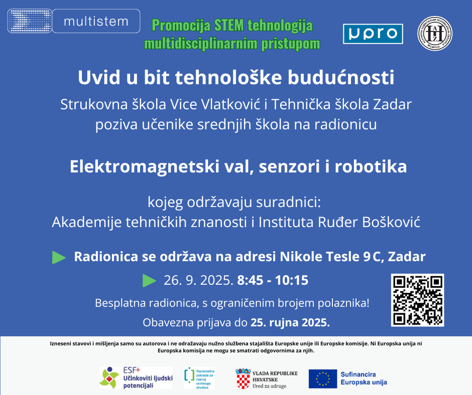 U Tehničko školi i Strukovnoj školi Vice Vlatkovića (Nikole Tesle 9C, Zadar) 26. rujna 2025. godine od 8:45 do 10:15 sati održava se radionica na temu: