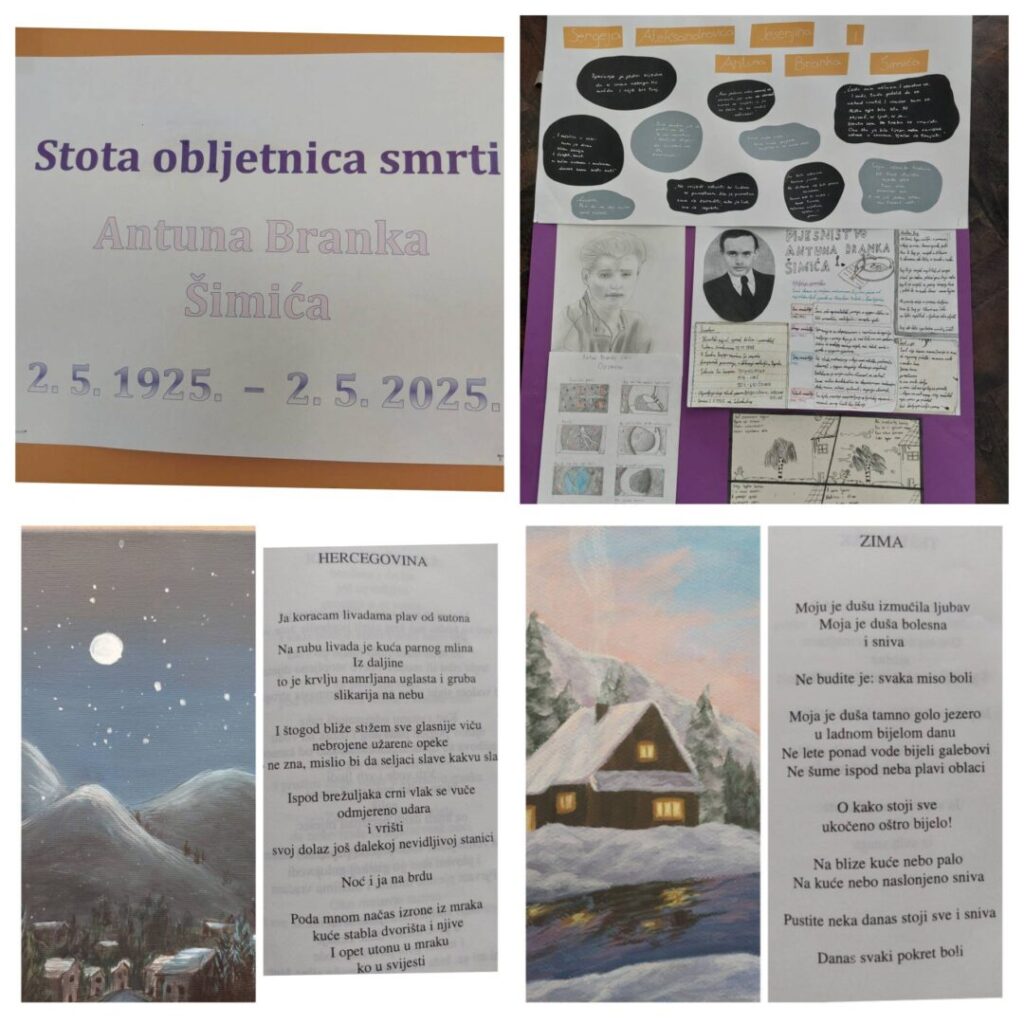 Povodom stote obljetnice smrti Antuna Branka Šimića 2. 5. 2025. učenici su čitali njegove poetske tekstove ekspresionističke tematike. Nakon čitanja Šimićevih pjesama učenici su izrazili svoju kreativnost spajajući crtež i tekst tako su nastali izvrsni likovni radovi vezani uz temu.